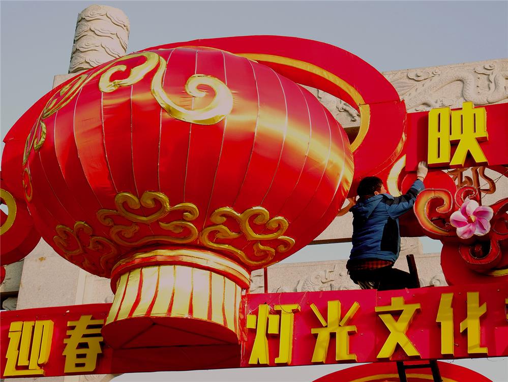 拍摄于威海威高民俗文化村,工匠师傅精心布展威海首届迎春灯光文化艺术节。
