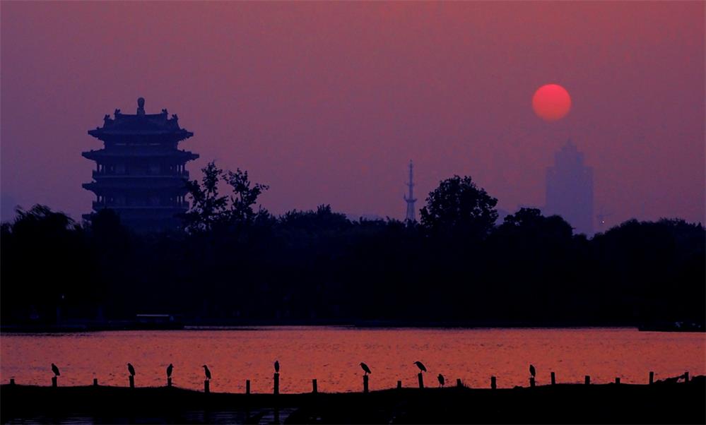 济南大明湖畔红日东升。