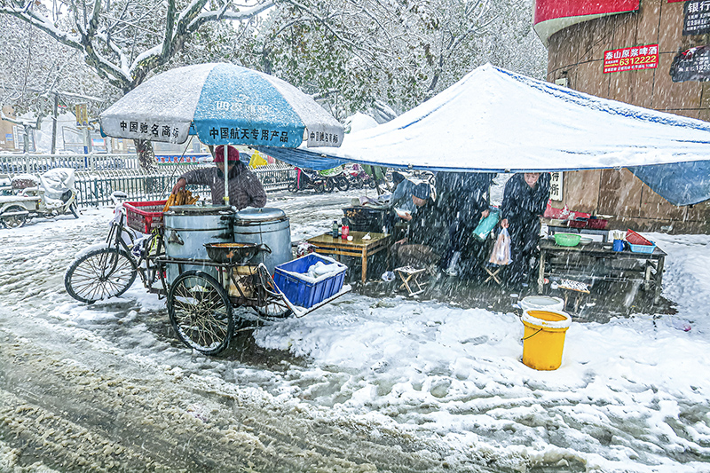 一场大雪,给人们的生活带来不便,这位摊主能在寒冷中给人们以温暖,恰似雪中送炭。