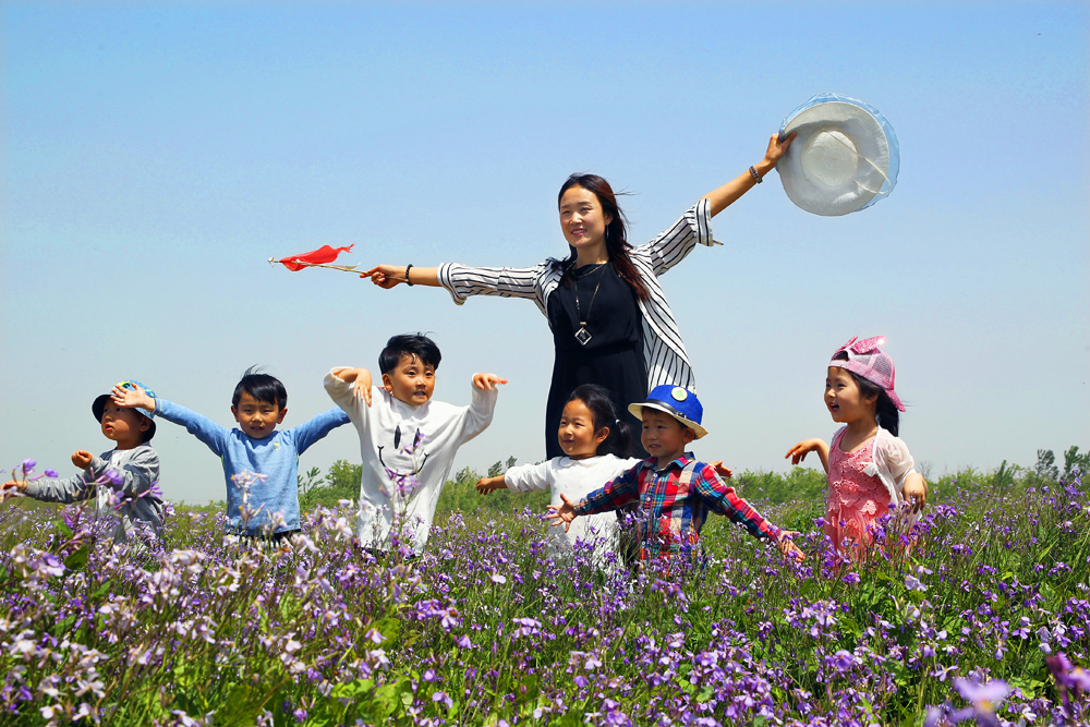 少年儿童在湿地鲜花中欢跃