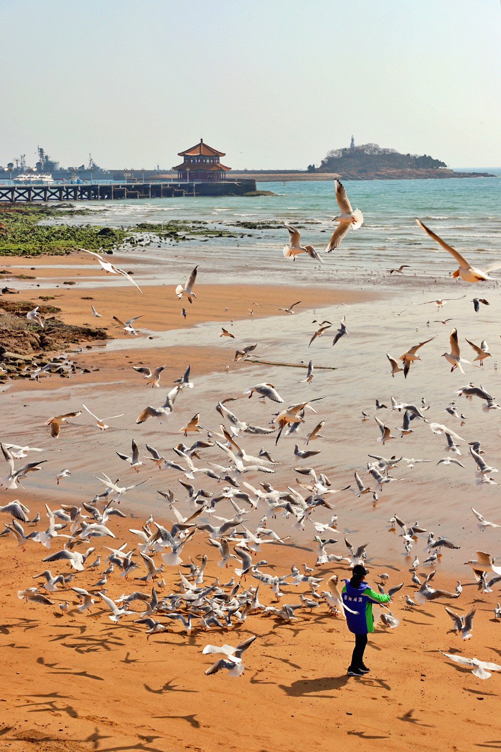 疫情期间,工作人员在青岛栈桥区域集中喂食海鸥