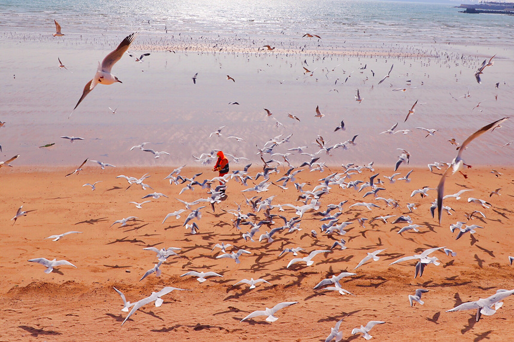 疫情期间,工作人员在青岛栈桥区域集中喂食海鸥