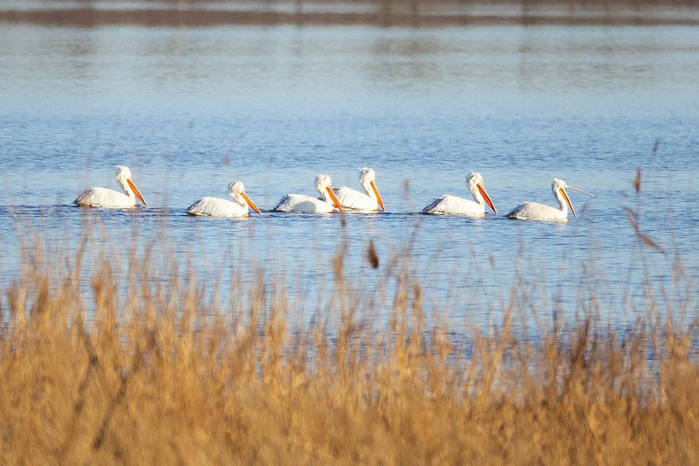 《珍稀濒危鸟类卷羽鹈鹕飞临东营市河口城郊》